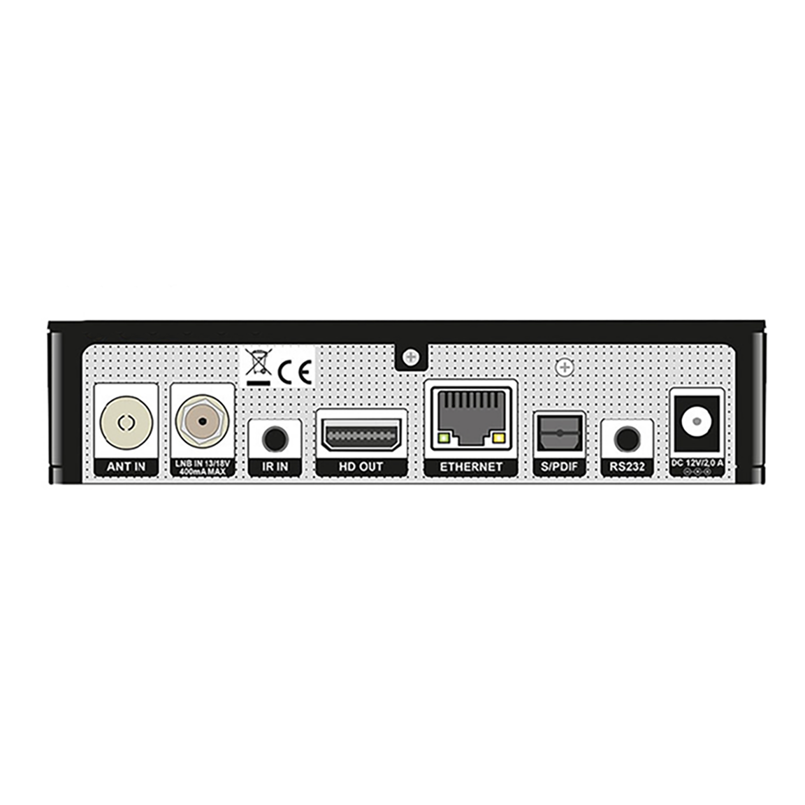 Back Panel:Input Sat-IF- 1x F-type Input, RF- 1x IEC-type Connection, TV: 1x HDMI Video output (digital), 1x HDMI Audio output (analog), Standard optical (S/PDIF), 1 x Ethernet plug, 1 x Jack to RS232, 1 x Jack to IR, 1 x DC in (for the external PSU).