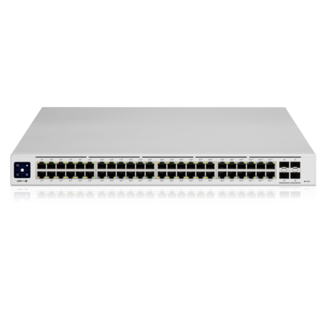 UBNT-USW-Pro-48-POE - UniFiSwitch Gen2 Pro-48 port PoE The USW-Pro-48-POE is a configurable Gigabit Layer2 and Layer3 switch with auto-sensing 802.3at PoE+ and 802.3bt PoE++. Forty PoE+ and eight PoE++ RJ45 ethernet ports have total 600W PoE budget, and four SFP+ ports offer 10Gbps uplink options. Near-silent cooling and a 1.3" touch LCM.